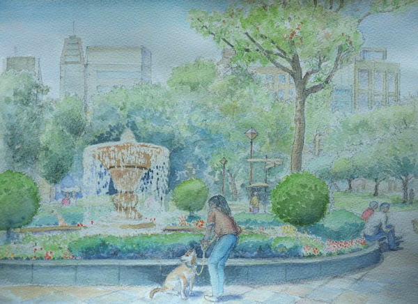 噴水花壇 晩春、チューリップの花が 公園のあちこちに咲き誇る 横浜公園 噴水が風に揺れる 木々の緑も濃さを増して 木の葉の上で光が躍っている 緑が目を休ませてくれる |
