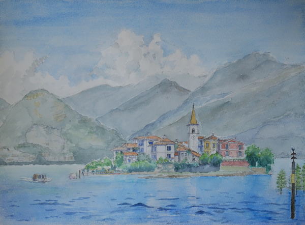 漁師の島遠望 マッジョウーレ湖に浮かぶ 島を隣の島から望む 背後の山々が聳える |
