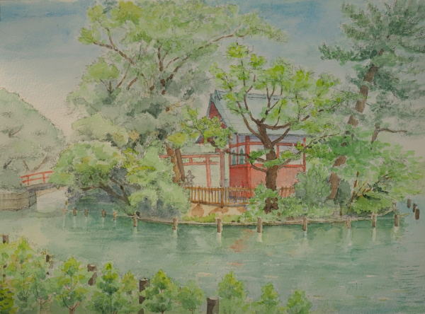 若葉輝く池中の島 洗足池 東京 東急池上線の駅前に ある大きな池 この時期、桜が園内 のあちこちに咲き誇る 池中の浮島に小ぶりな 赤い社の弁財天が見え 木々の若葉が眩しく 水辺の景観も美しい (かつて勝海舟の別荘 があった。勝夫妻の墓や 西郷隆盛の詩碑もある) |