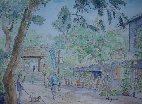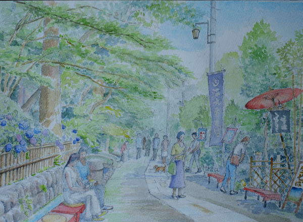 アジサイ咲く深大寺前 深大寺の垣根に咲く アジサイがきれい お蕎麦屋さんが並ぶ |