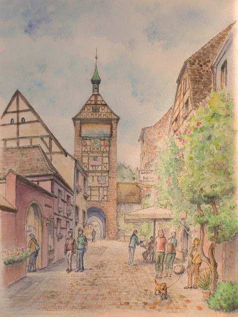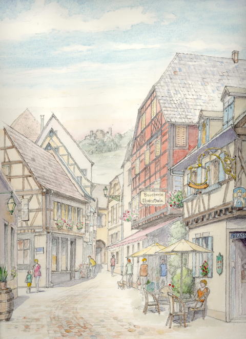 Ribeauville リボーヴィルの街並み 道路に立ってしばし描く、 遠景の山にお城が見える |