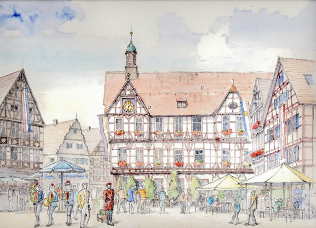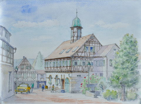 | 小さな町の役所 Baldenbuch の市庁舎 (少し小高い丘に建つ木組みの建物 教会の横からスケッチ、時々駐車違反 を取り締まる人が巡回していた) |