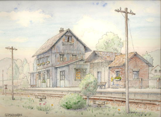 | 廃線の駅舎 Gomadingen (いつからかSchwaebischenalb-bahnシュバーベンのアルプ鉄道が 開通して駅舎として活躍している模様、自然豊か地域です) スケッチ用のパイプ椅子を買ってゆっくりスケッチできた。 |