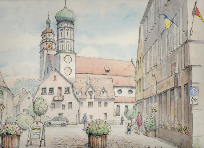 教会の見える広場 Giengenの町(ぬいぐるみのsteiff社がある) カフェバーの前に立ってスケッチ。背後で数人の人たちが 昼からビールを片手に会話を楽しんでいた |