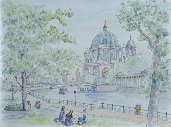 大聖堂の見える河畔 Berlin ベルリンの川畔、芝生広場に三々五々 集まって休憩する中、遊覧船が行き来する 川を挟んで聖堂のドームを眺めながらスケッチ |