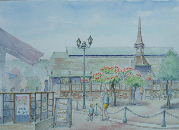 エトルタの旧市場 Etretat ねむの花が咲いていました。 メインストリートに面したレストランの 外の席を女店員に借りてしばしスケッチ 旧市場の入り口に立つ時計塔が面白い 右手方向の海岸には、モネなど画家 たちが描いたアヴァルの高い崖のあり、 素敵な砂浜の風景が広がります |