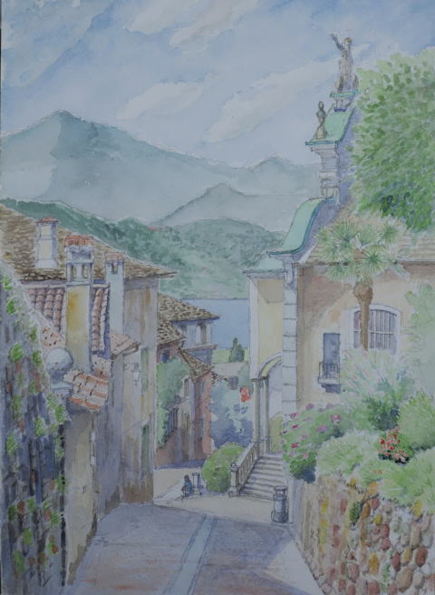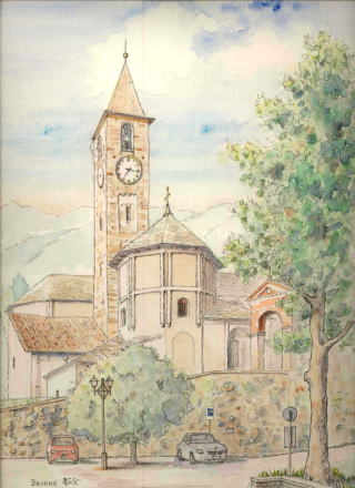 バヴェーノの教会 海岸道路から一段高い土地に 湖を見晴らせる教会 (12世紀に作られ始めた) (カソリック) マッジョーレ湖畔のバヴェーノ Chiesa dei Santi Gervasio e Protasio 以前描いたスケッチ イタリア湖水地方を 旅した折に、泊まった 港町。 朝食前、駐車場からスケッチ 爽やかな空気の中で 人がいない静かな時間を 気持ちよく楽しめました |